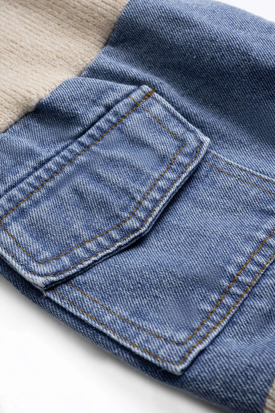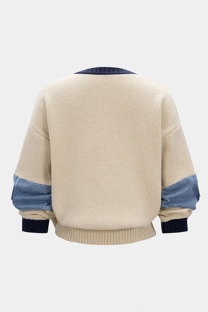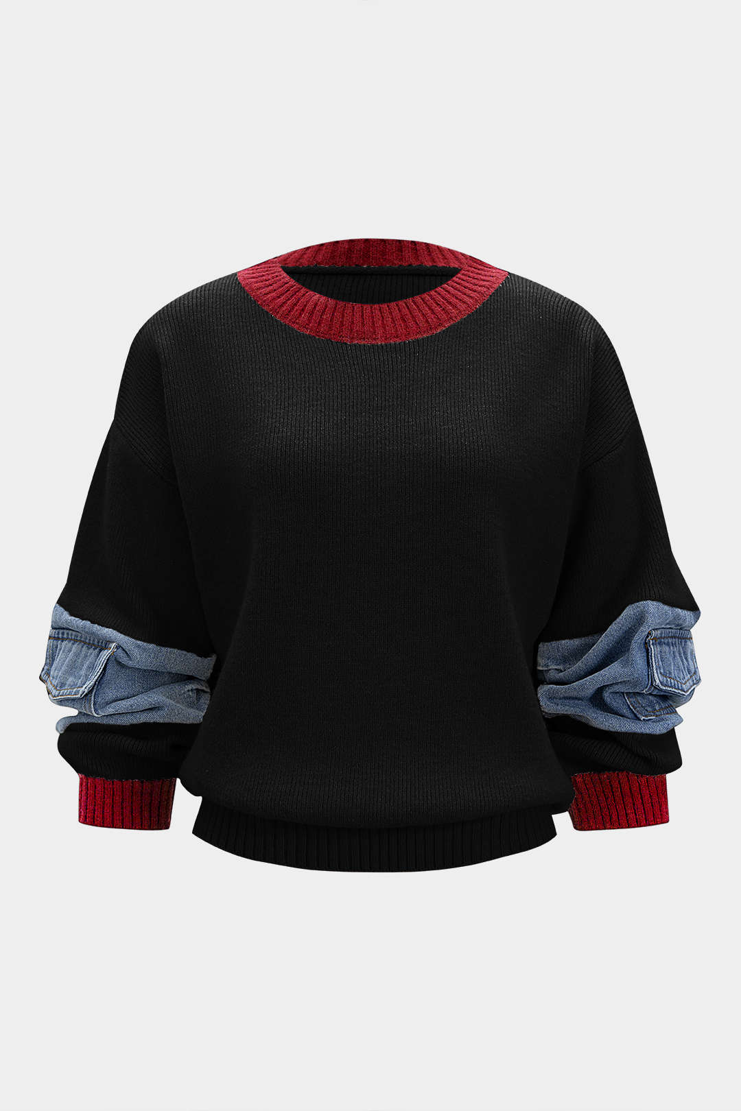 Knit Denim Patchwork Contrast Ribbed Long-Sleeve Top